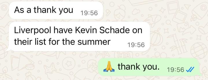 在绿帽哥晒出的聊天截图上,一位利物浦的消息人士表示:“利物浦已经将沙德列入了他们今夏的引援名单中。”